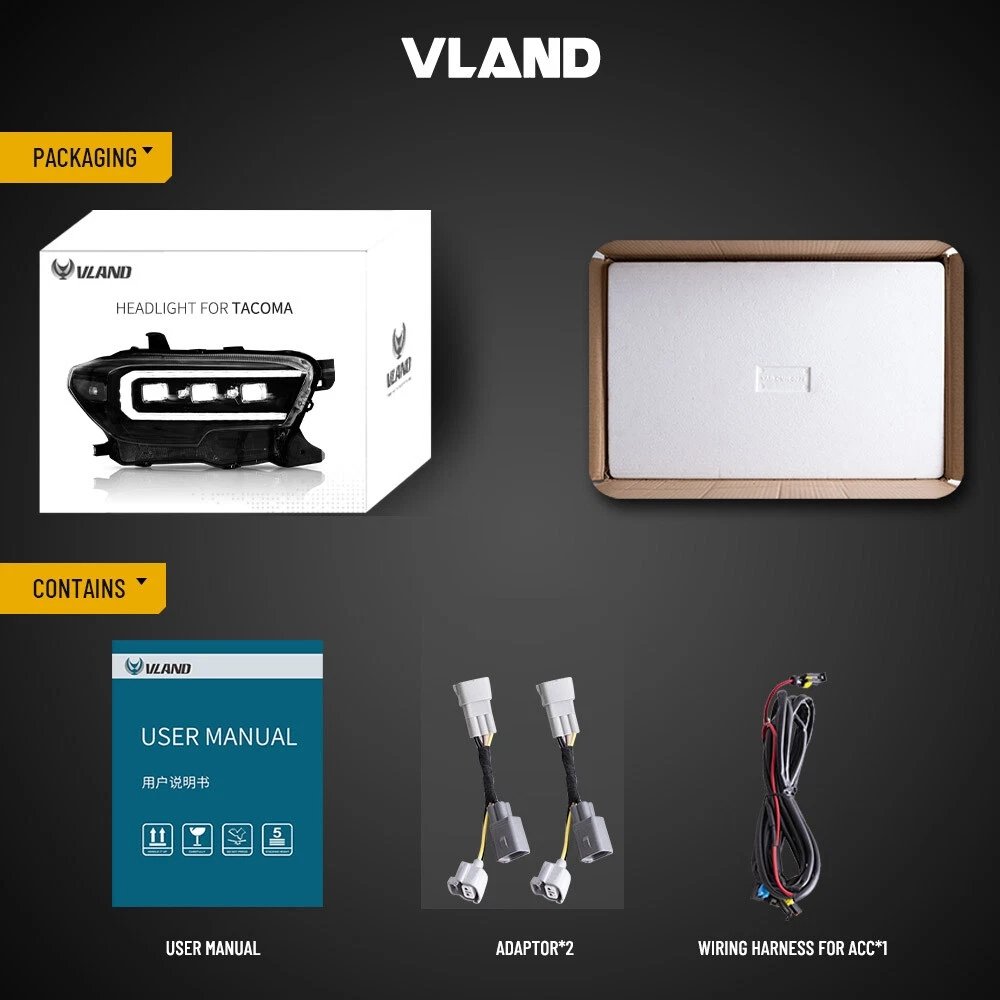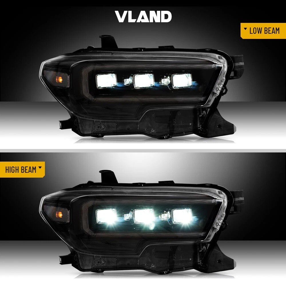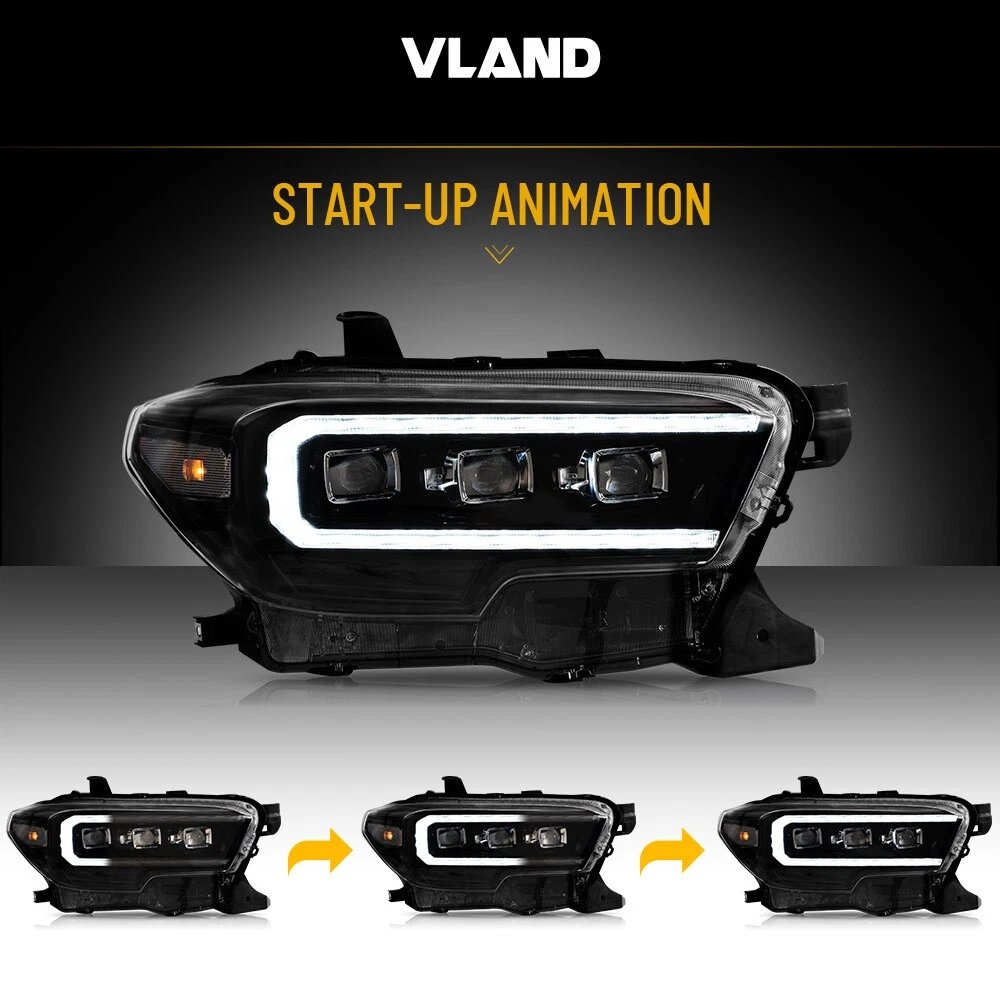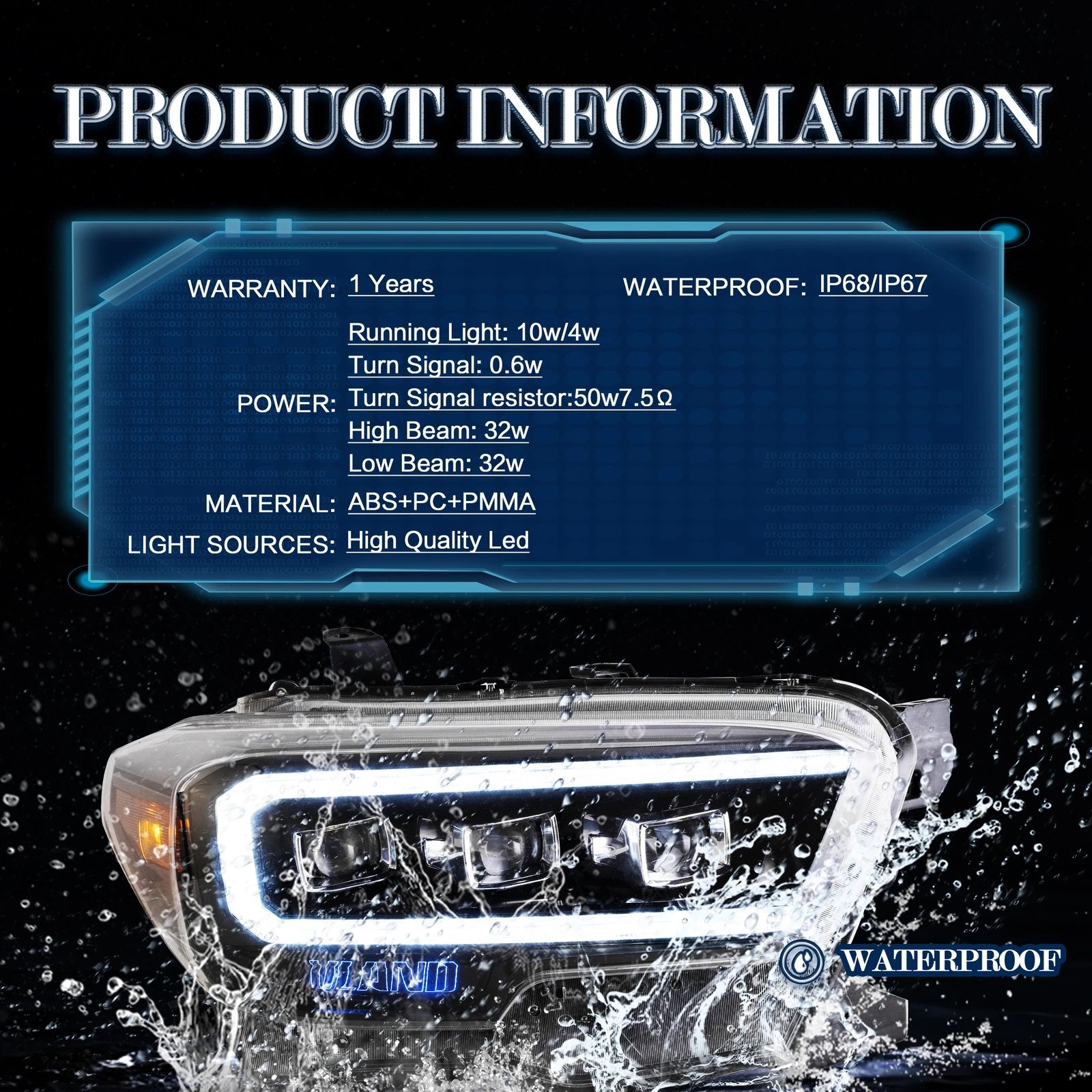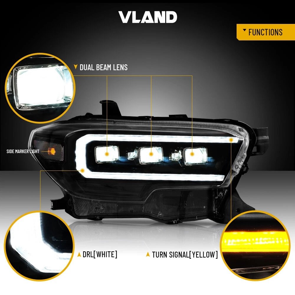 Functions: White LED Start-up Animation Running light/White LED DRL, Yellow LED Sequential Turn Signal, Clear LED Side Mark light, High Low Beam: Full LED, No Need Bulbs