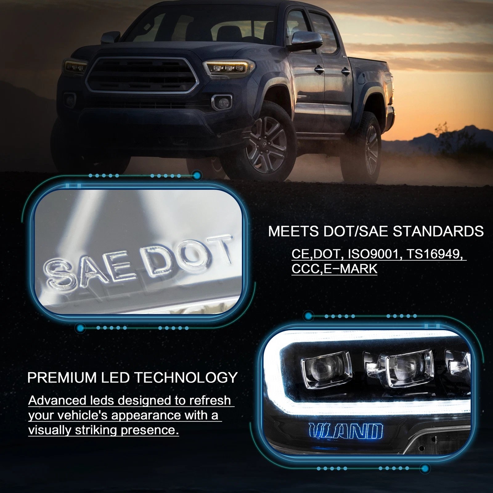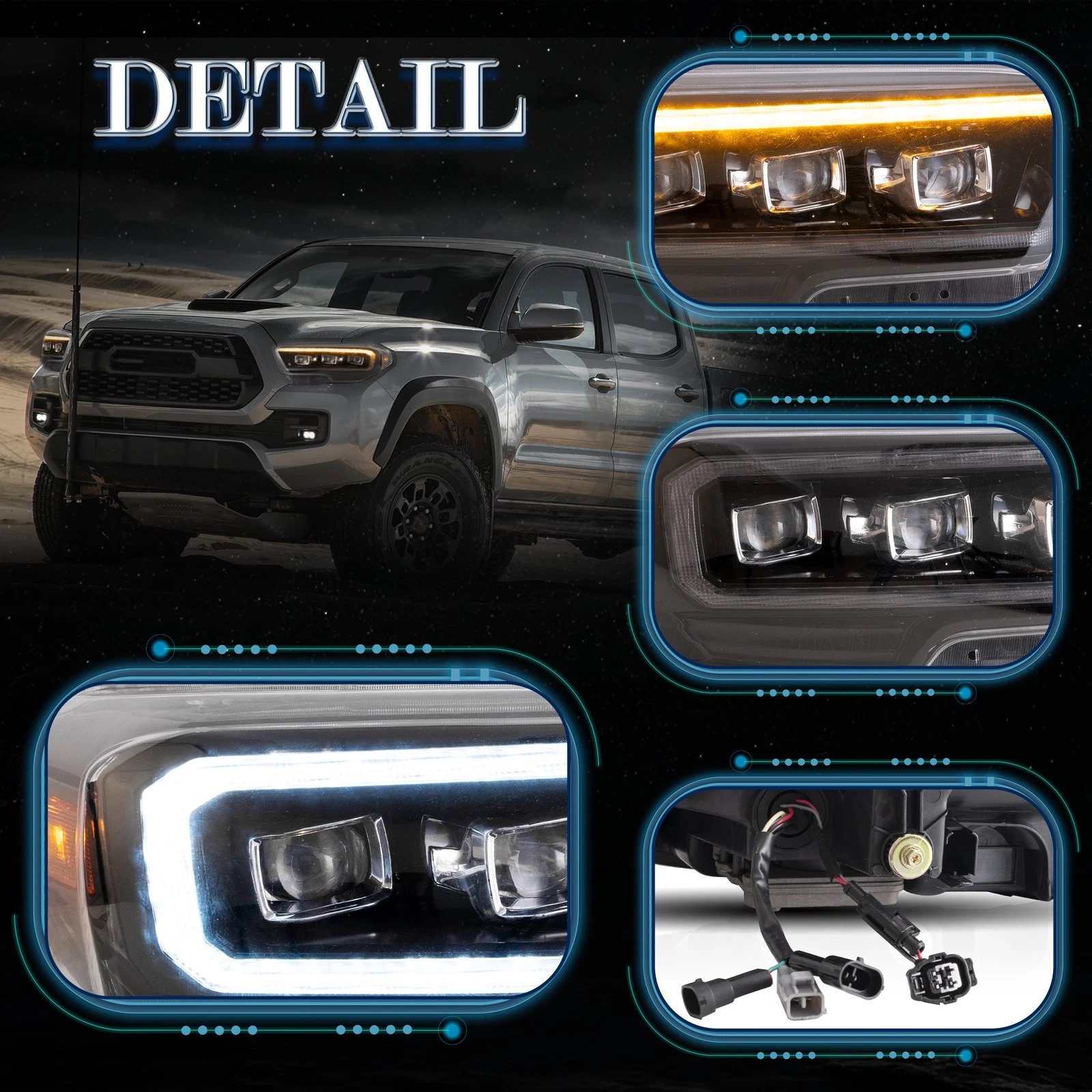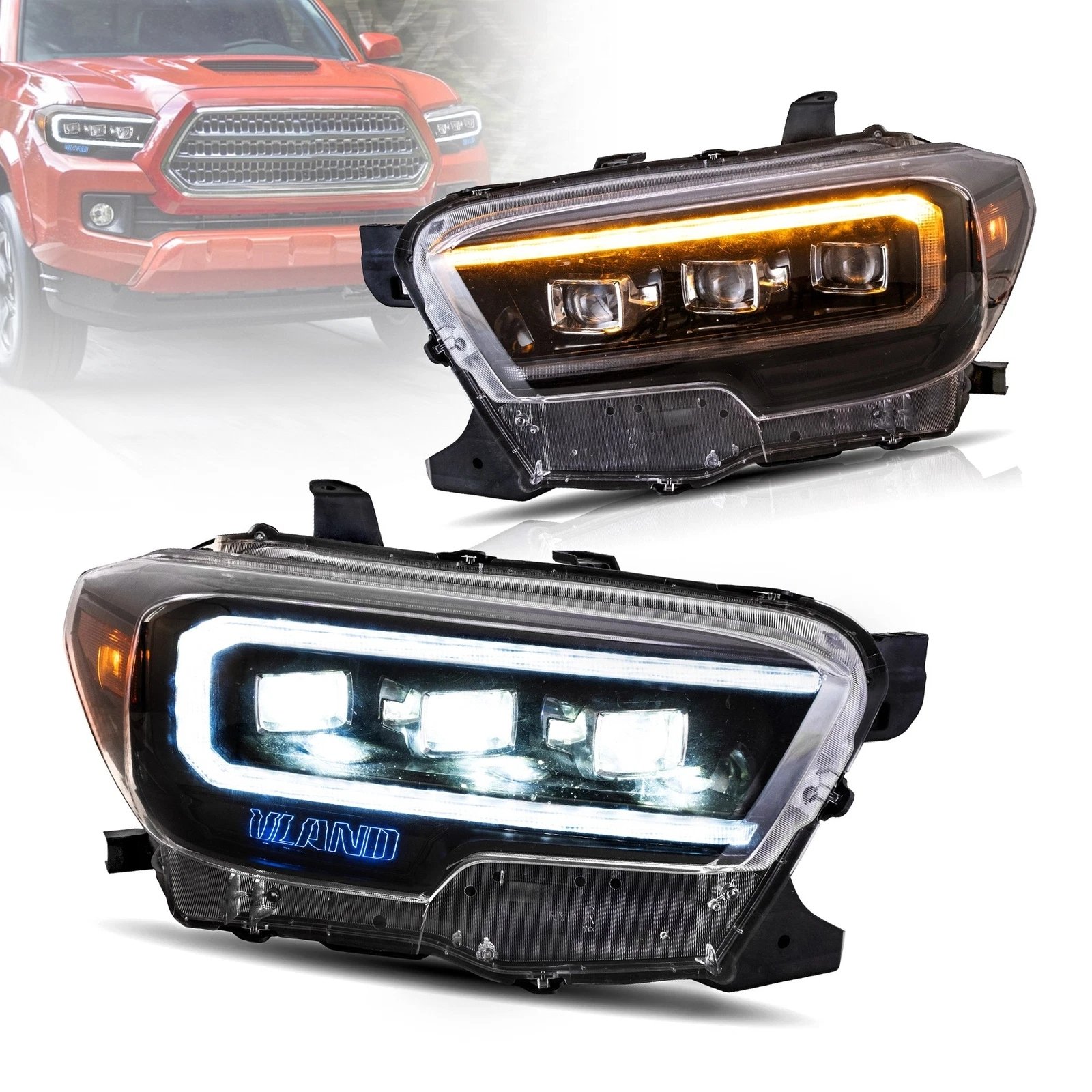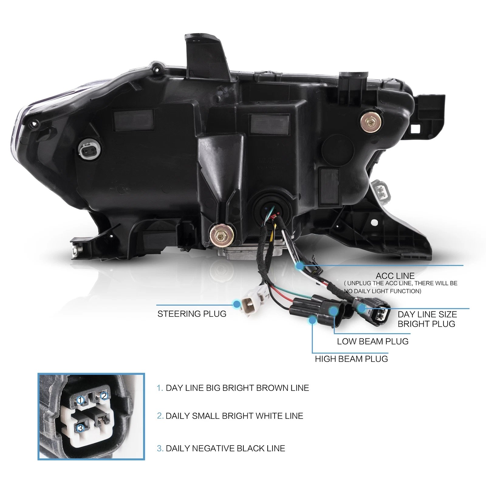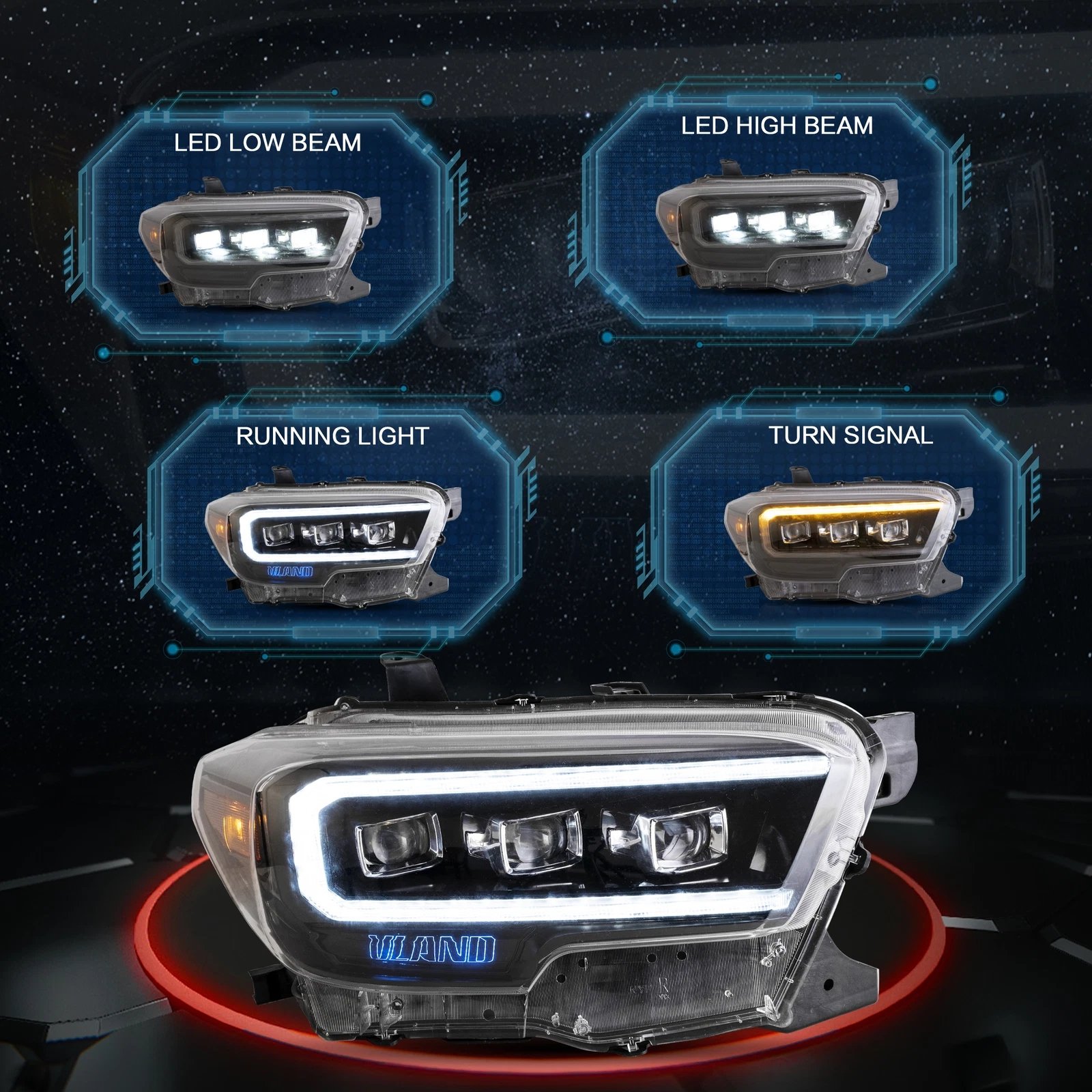 Functions: White LED Start-up Animation Running light/White LED DRL, Yellow LED Sequential Turn Signal, Clear LED Side Mark light, High Low Beam: Full LED, No Need Bulbs