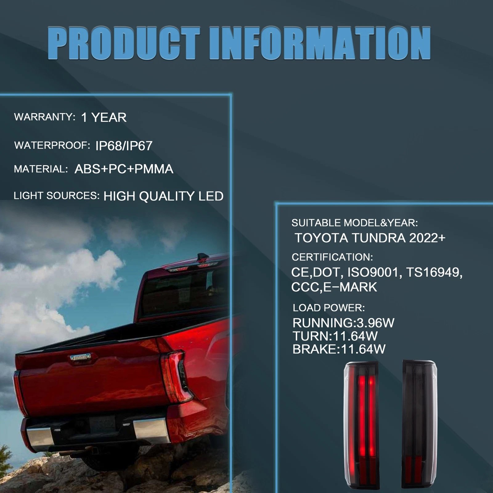Upgrade your vehicle’s lighting and style with this high-quality aftermarket LED Tail Lights, designed specifically for Toyota Tundra 2022-2024. This product delivers enhanced brightness, improved visibility, and a modern appearance. Perfect for replacing worn or outdated original lights.