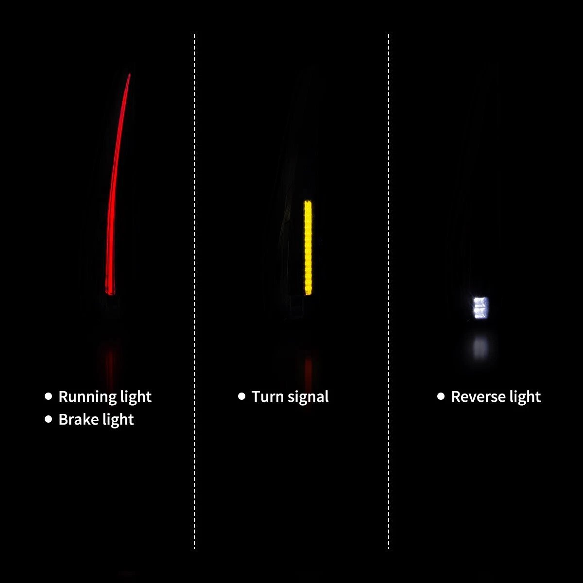 • Custom Full LED Display- Amber led turning light. This tail lamp design provides an awesome enhanced appearance to your vehicle. Full LED rear lights are a nice upgrade over factory style bulbs. The fiber optic layout (when illuminated) displays a very appealing tail light design.