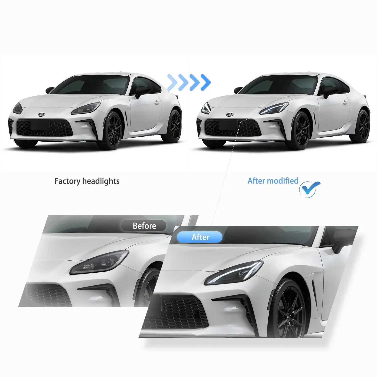 Fitment:For Toyota 86 GR86 & Subaru BRZ 2nd Gen ZN8/ZD8 [2022 2023 2024]Certification:DOT/SAEItem Feature:High Beam: Full LED ProjectorLow Beam: Full LED ProjectorRunning Light: LED (Diamond White)Turn Signals: LED (Amber. With Sequential Turn Signal)Start-up Animation:With Start-up AnimationBulb Recommendation:Full LED Hi/Lo beam, no need bulbs.Description:The package includes: 1 pair of headlights with left side & right side.This item has the same connections and wires with the original headlight assembly. It is easy to install still professional installation is recommended.
