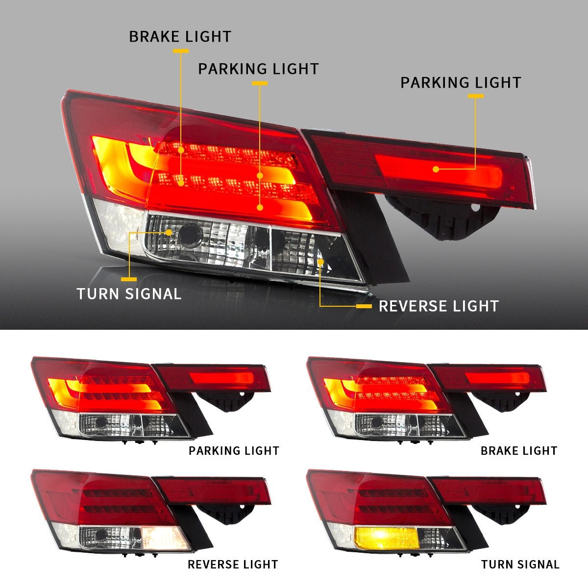 • Fitment: 3D LED bar 4 PCS tail lights assembly Compatible for 08-12 Honda Accord 8th Gen Inspire Sedan. Designed as a perfect replacement for your OE lights, they install the same way as factory units. Not fit for Crosstour Fastback Model