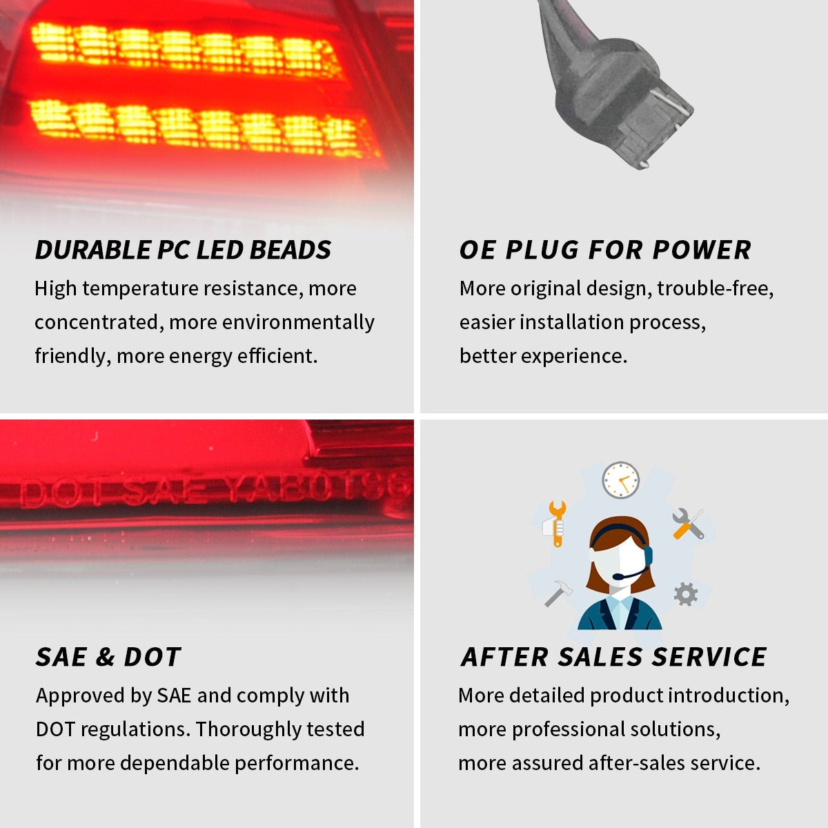 • Exclusive Custom Style – Stylish 3D LED running parking light. Durable red and clear lens. Exact OE replacement, plug and play. Provide you stronger concentrated light output in comparison to ordinary tail lamps.