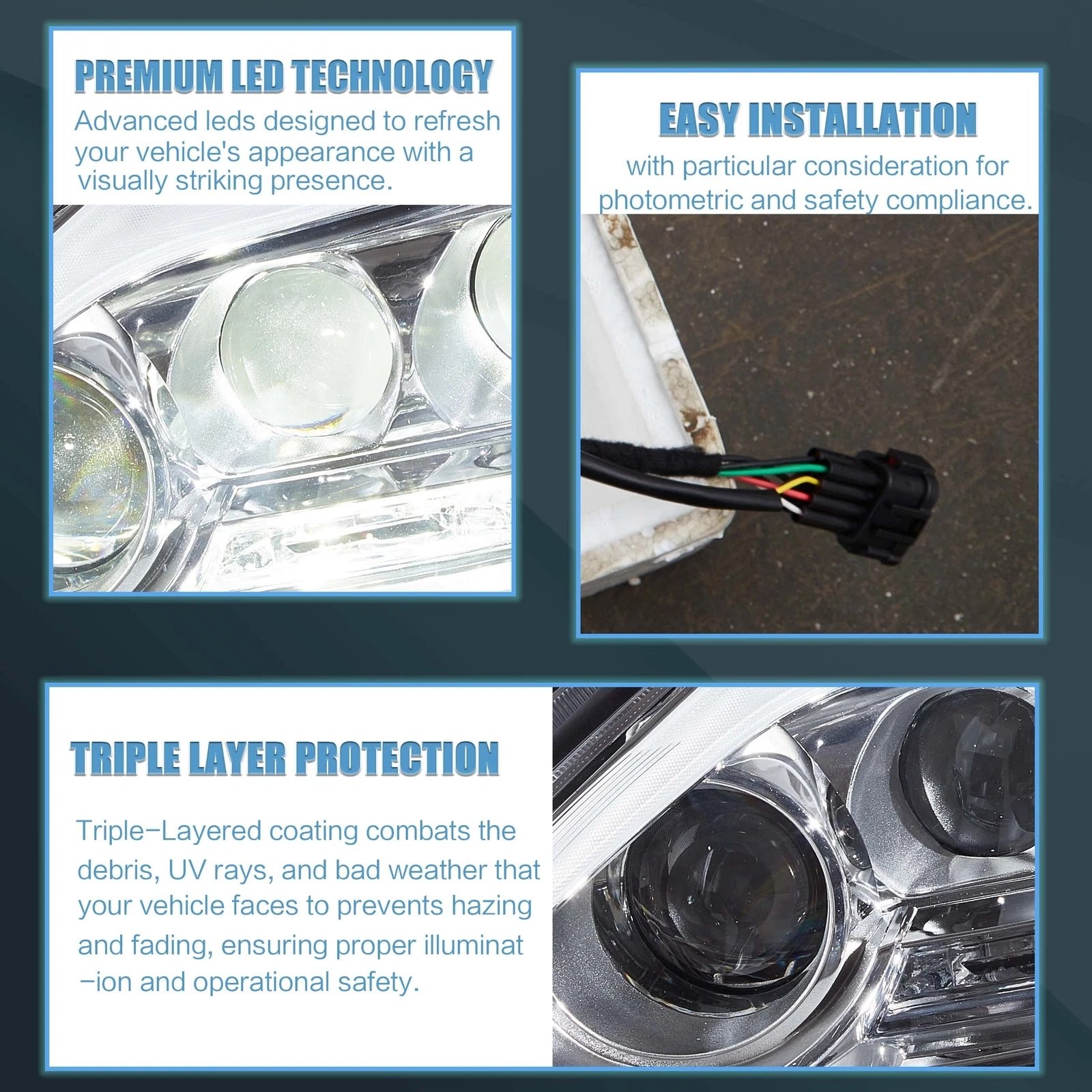 • LED running lights, LED turn signals, LED high and low beam. Safer driving at night with brighter light using the latest technology. Give your car a new identity and uniqueness. Gamechanger for the look and style of your car!