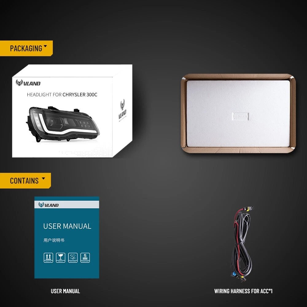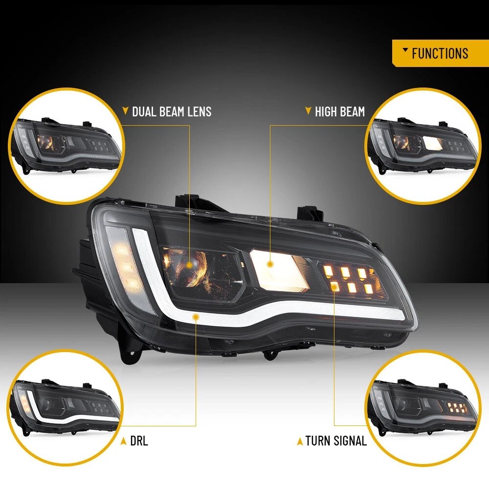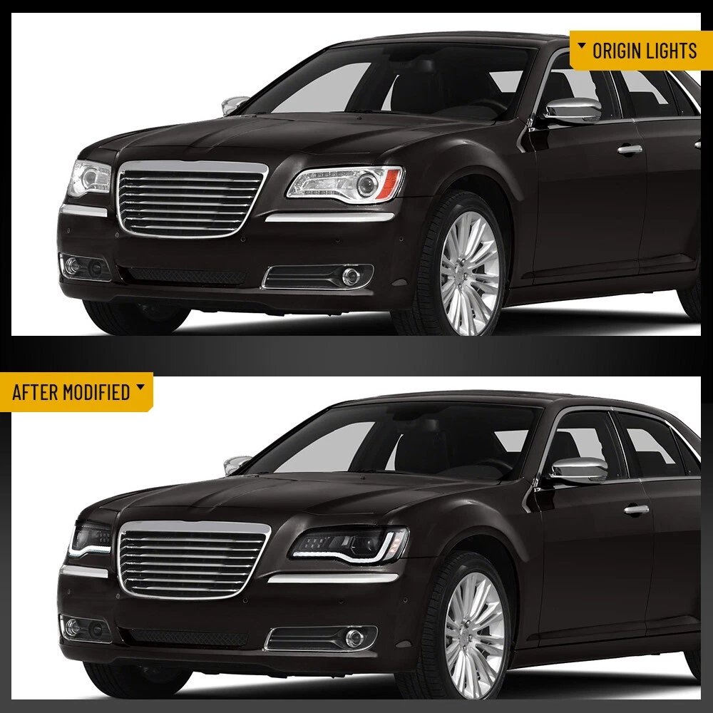 • Fitment – Chrysler 300/300C  2011 2012 20113 2014 2015 2016 2017 2018 2019 2020 2021 2022 2023. Designed as a perfect replacement for your OE lights. Package included: A set of headlights (driver & passenger side), 1 user manual, 1 set of acc harness.